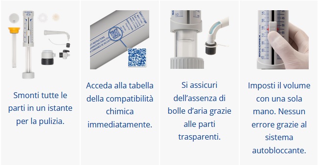 Il modello CalibrexTM organo 525 è dotato di uno stantuffo im ceramica nei modelli fino a 5 ml e in vetro smerigliato oltre i 10 ml, ideali per sostanze organiche, nonché soluzioni acide e basiche non cristallizzanti.